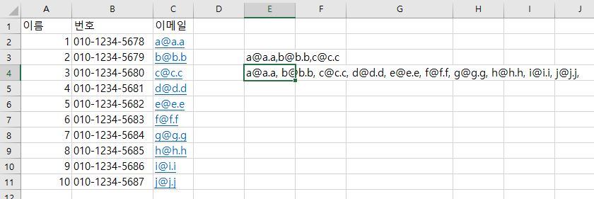 저희가 원하는 건 이메일을 ,으로 구분하면서 계속 합치고 싶은 건데 그걸 여기서는 내용을 계속 더해간다고 생각하세요!